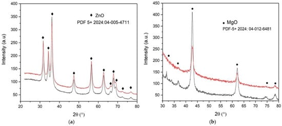 To assess the crystalline structure, XRD analysis was performed. All the diffraction peaks of the calcinated ZnO samples can be indexed to a hexagonal structure, which is very well matched with card number 04-005-4711, as presented in Figure 4a. Also, all the diffraction peaks of the calcinated MgO samples can be indexed to a cubic structure, which is very well matched with card number 04-012-6481, as presented in Figure 4b.