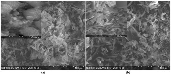 SEM morphologies of MgO NSs elaborated with ovalbumin from Mg (II) (a) 1M and (b) 2M.