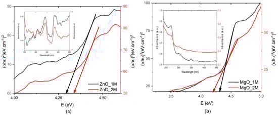 UV-VIS spectra and Eg plot of ZnO and MgO NSs elaborated with ovalbumin at (a) 1M and (b) 2M.