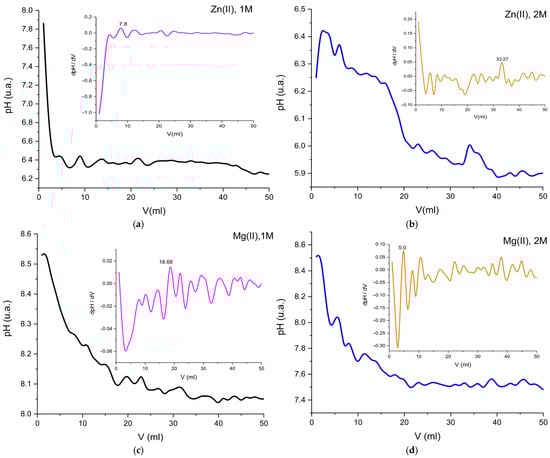 Graphical representation of the pH = f(V) variation for Zn(II) solutions ((a) 1M and (b) 2M) and Mg(II) ((c) 1M and (d) 2M).