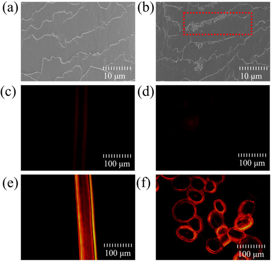 The deposition and penetration behavior of hydrolyzed keratin was investigated using SEM and a fluorescence microscope. The SEM images of untreated hair and hydrolyzed-keratin-treated hair samples are shown in Figure 1a,b, respectively. Comparing the two images, it can be observed that there was a significant deposition of keratin at the edges of the hair cuticle scales (the red box in Figure 1b), which is consistent with Malinauskyte’s findings [25]. Figure 1c,d shows the surface and cross-sectional images of hair samples treated with the free fluorescent dye after dialysis treatment, which presented a very subtle fluorescence. This distinctly differs from the orange-red fluorescence shown in Figure 1e,f, which verifies that hydrolyzed keratin can significantly deposit on the cuticle and penetrate into the hair cortex. Considering a moderate average molecular weight of about 3000 Da, the penetration and deposition of hydrolyzed keratin could both occur during the treatment. Some small molecules from the highly hydrolyzed keratin may permeate into the hair cortex, while the majority accumulate and deposit on the hair cuticle due to their large molecular weight. This finding is consistent with that of Malinauskyte in that mid-range MW hydrolyzed keratin could penetrate deeper into the cortex, and high-MW keratin peptides only penetrated the outer layers of the cortex [25].