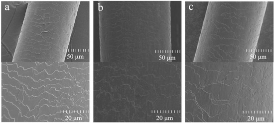 To investigate the photoprotective effect of hydrolyzed keratin on hair, hair samples treated with hydrolyzed keratin solution were bundled together and placed in a xenon lamp aging chamber for 6 days at 35 °C and 60% humidity, and the untreated hair served as the control group. As shown in Figure 2a,b, there was some cuticle erosion caused by UV radiation, making the hair cuticle rough and uneven. This finding is consistent with the literature [16,29]. However, as shown in Figure 2c, hair samples treated with hydrolyzed keratin only presented slight hair surface damage after exposure to UV radiation. The results prove that the hydrolyzed keratin film deposited on the hair surface can effectively prevent UV damage, playing the role as a UV reducer. (Additional images are available in Supplementary Materials (Figures S1–S3)).