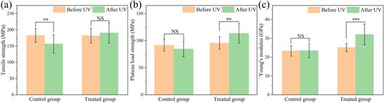 (a) Tensile strength, (b) plateau load, and (c) Young’s modulus of hair samples in the UV damage experiment. (NS: no significance; p: ** < 0.01, *** < 0.001).