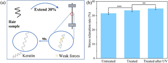 To elucidate the mechanisms of the UV-induced strengthening effect of hydrolyzed keratin on hair, stress relaxation tests were conducted on hair samples before and after UV radiation. This test is usually employed to compare the proportion of weak intermolecular forces within different hair samples [30]. As illustrated in Figure 4a, during relaxation, weak chemical bonds including hydrogen and ionic bonds were broken within 90 s after the stress was applied, while strong chemical bonds such as covalent bonds remained. As depicted in Figure 4b, the treated group showed an enhancement in the proportion of weak chemical bonds by 6.56% compared with the untreated group, suggesting that the deposition and penetration of hydrolyzed keratin on hair enhances the internal chemical bonds within the hair. Moreover, after UV radiation, the treated group showed a further increase of 3.85% in the proportion of weak chemical bonds, indicating that UV radiation promoted the strengthening of the internal chemical bonds. Therefore, it can be concluded that hydrolyzed keratin not only acts as a UV reducer, which reduced hair damage, but also serves as a strengthener, enhancing the hair’s overall strength.