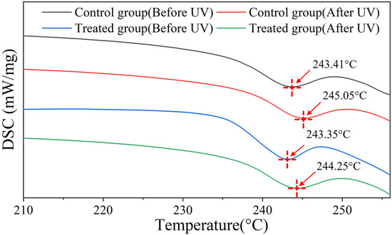 Thermal stability tests conducted on hair using DSC yielded comparable results, which are presented in Figure 5. It can be seen that, after UV radiation, the melting temperature of the control group shifted from 243.41 °C to 245.05 °C, which indicates more intermolecular forces created by fiber brittleness caused by UV [31]. In comparison, the group treated with hydrolyzed keratin protection also showed a smaller shift after UV radiation, with the peak position shifting from 243.35 °C to 244.25 °C. However, fiber brittleness seems unlikely for the treated group since the tensile properties did not show any reduction. Therefore, the peak shifting towards higher temperatures for the treated group should be ascribed to the formation of new intermolecular forces after UV irradiation, which is consist with the stress relaxation results.