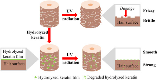 In this work, the performance of hydrolyzed keratin in protecting hair from photoaging was evaluated in terms of surface morphology and hair tensile test. The deposition and penetration behavior of hydrolyzed keratin were confirmed by fluorescence labeling experiments and Scanning Electron Microscopy (SEM) experiments. The roles of hydrolyzed keratin as a UV reducer and hair strengthener during UV radiation were demonstrated. Finally, based on the results of the stress relaxation test and Differential Scanning Calorimetry (DSC) analysis, a UV-induced degradation–penetration mechanism for the strengthening effect of hydrolyzed keratin on hair is proposed.