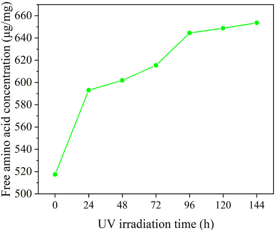 The hydrolyzed keratin solution was diluted to 2 wt% and equally divided into seven portions. All samples were dried in glass beakers using a vacuum drying oven (RSD-020Z, Royalstar, Hefei, China) to obtain dry films. The dry films were exposed under 365 nm UV radiation (PL-L 18W/10/4P, Philips, Amsterdam, The Netherlands) at 3.5 W/m2 for 6 days, simulating ten-day UV exposure (2 h/day) in Shanghai, China [41]. One sample was taken out every 24 h and subsequently dissolved in water and subjected to free amino acid testing using ninhydrin assay [42].