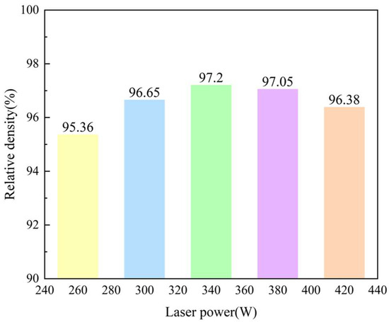 Relative density change in the samples printed with the different laser powers.