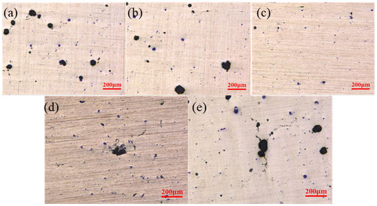 Defects shown on the samples printed using different laser powers. (a) 260 W; (b) 300 W; (c) 340 W; (d) 380 W; (e) 420 W.