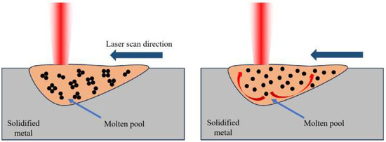 As the laser power increases, excessive energy is input into the melt pool, overheating it, pushing the melt pool center to the edge of the very high temperature gradient caused by a strong inward Marangoni flow, exacerbating the instability of the melt flow, increasing gas capture, and making porosity defects easy to form. Figure 4 below shows the schematic diagram of Marangoni convection. Shrinkage holes form between the matrix and reinforced phase. High-power laser energy also causes the melt pool to be too big, the liquid phase surface energy to be too low, and the melt pool stability to be compromised, causing interior metal droplets to splash violently. Spheroidization defects, which affect the flatness of the solidified layer surface, the difficulty of laying powder, and the interlayer’s metallurgical quality, are easily caused by splashing droplets that form micron-sized fine metal balls on the current layer. The melting pool temperature is too high, resulting in low melting points of Zn, Mg, and other elements, selective evaporation, and metal vapor. SLM’s high cooling rate prevents metal vapor from escaping, causing recoil pressure on the melting pool to form irregularly shaped locking hole defects. The aforementioned three factors reduce molded part density.
