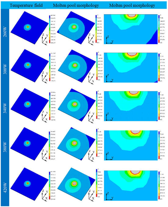 To prove the theory proposed here, finite element theory was employed in this part to study the molten pool of the samples printed under different laser powers. The temperature distribution and morphology of the molten pool are shown in Figure 5.