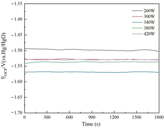 The open-circuit potential of the sample printed under different laser powers can be seen in Figure 9. The specific parameters are listed in Table 2. The material’s open-circuit potential is −1.499 V at 260 W laser power. As laser power increases to 340 W, the material’s open-circuit potential drops to −1.569 V. With increasing laser power, the powder bed temperature in the molding process rises, precipitating some less reactive trace elements and harmful impurities from the matrix to the anodic alloy surface, increasing the surface’s active point rapidly. Some hazardous contaminants can create corrosion microcells with a pure aluminum matrix, speeding sample surface response and lowering open-circuit potential. As laser power increases, the metal liquid phase stays too long, the sample grain experiences overgrowth, the number of grain boundaries decreases, reducing the discharge active sites of the anode alloy, and the open-circuit potential becomes positive. At 420 W, the material’s open-circuit potential is −1.529 V.
