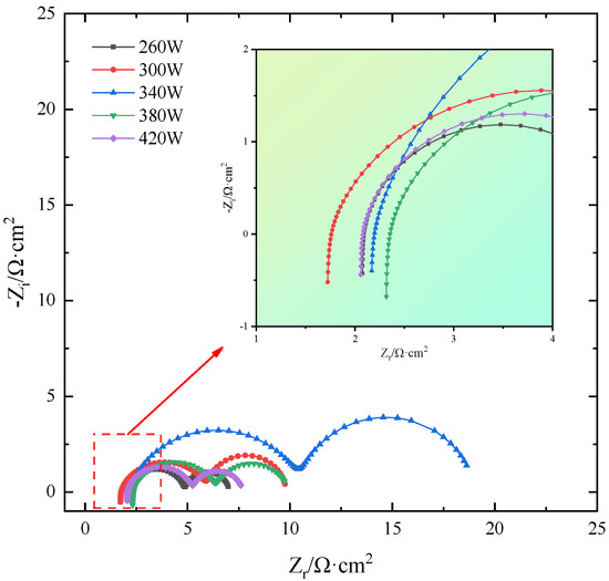 The EIS fitting curves of SLM-formed TiB2/6061 composite samples in salt-based alkaline electrolytes under different laser powers are shown in Figure 11, and Table 4 shows the EIS AC impedance fitted parameters. The figure shows that as laser power increases, the size of the semicircular capacitance arcs in the sample’s EIS curves increases first and then decreases because the larger the radius, the better the samples’ corrosion resistance. Therefore, sample corrosion first increases and then decreases. Since the typical sample’s corrosion resistance improves with the capacitance arc radius, its corrosion degree reduces first and subsequently increases. The correlation coefficient χ2 in the fitting parameter table reflects the degree of correlation between the fitted data and test data for each anode alloy. A smaller number implies more accurate fitted data. Table 4 shows that the χ2 values of the fitted data for each sample are below 10−3. This suggests that the data more accurately reflect the results of EIS testing of the anode alloys in a salt-based alkaline electrolyte.