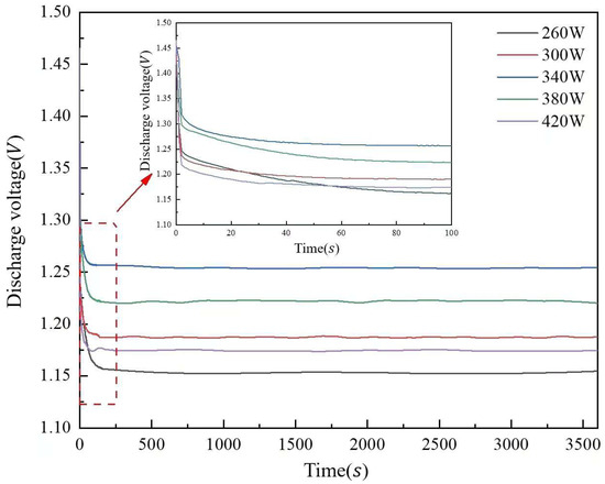 Figure 13 illustrates the discharge voltage curves of aluminum anode printed under different laser powers. The discharge voltage of the aluminum–air cell is 1.153 V at 260 W laser power, 2.95% and 8.76% higher at 300 W and 340 W, respectively, and 1.254 V at 340 W. When the laser power is raised to 380 W and 420 W, the discharge voltage drops 2.55 and 6.38% from 1.254 V. When the laser power is raised to 380 W and 420 W, the discharge voltage drops 2.55 and 6.38% from 1.254 V. The surface pore distribution, densification, and microstructure morphology of the aluminum matrix composite anode cause the discharge voltage to increase and then decrease with laser power. The reason for this phenomenon is related to the improvement of the anode surface quality. As the anode surface defects decrease, the contact area between the anode and the electrolyte increases, which improves the discharge performance. When the laser power reaches 340 W, the surface quality of the anode is optimized with a more uniform pore distribution and better material densification, resulting in the highest discharge voltage.