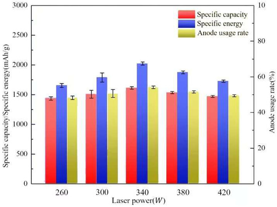 Specific capacity, specific energy, and usage rate of the anode printed under different laser powers.