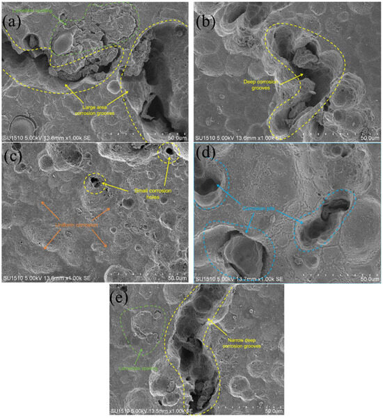 Figure 13 and Figure 14 show that in the moderate laser power interval, the discharge voltage, anode utilization, specific capacity, and specific energy of the aluminum–air batteries increased and then decreased due to the surface pore distribution, densification, and microstructure morphology of the porous aluminum anode. SEM was used to determine the surface morphology of the aluminum matrix composite anode after discharge to assess how laser power affects porous aluminum anode discharge performance (Figure 15). The figure shows that the discharge surface of 260 W and 300 W aluminum matrix composite anodes is rough and has corrosion grooves with lengths exceeding 50 μm, indicating severe corrosion. When the laser power is 340 W, the discharge surface of the aluminum composite anode is relatively flat, the corrosion morphology shows obvious and crystalline corrosion, the aluminum anode in the discharge process shows uniform dissolution characteristics, the discharge process is stable, the number of active sites of the self-corrosion reaction is small, and hydrogen precipitation has been suppressed, so the aluminum anode alloy under the power As laser power increases to 380 W and 420 W and the corrosion degree of the aluminum anode worsens, resulting in larger pits and deeper grooves with a diameter of 38 μm. This is linked to poor composite material forming quality. Figure 16 shows that when the aluminum anode sample has fewer pore defects and smaller sizes, surface tension inhibits the electrolyte from penetrating the defects. As a result, discharge dissolution and hydrogen corrosion are more uniform, and the corrosion morphology is relatively flat. When the material has many cracks or holes, the electrolyte penetrates to increase the corrosion area and discharges to form corrosion pits and grooves, allowing more aluminum to participate in the hydrogen precipitation corrosion reaction. In conclusion, aluminum composite anodes consume anode material for both discharge and hydrogen precipitation reactions, but the sample with high forming quality has a low hydrogen precipitation corrosion rate, so the anode mostly undergoes discharge and has high discharge performance.