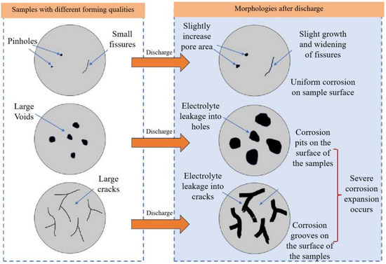 With the increasing size and amount of voids and cracks, electrolytes were more easily leaked into the center of the anode, which resulted in the voids and cracks increasing on the surface of the sample and caused severe corrosion expansion to occur. The self-corrosion rate, open-circuit potential, polarization curve, EIS curve, and constant-current discharge performance all confirmed the results given above. The morphologies of the surface morphology of anodes after discharge further verified the conclusions given before.