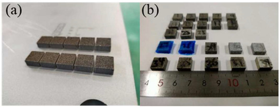 SLM-formed aluminum matrix composite samples. (a) Samples on base plate; (b) samples after wire cutting.