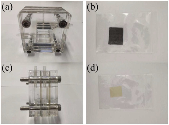 Aluminum-air battery discharge tester. (a) Front view of double electrolyte mold; (b) cathode carbon paper; (c) side view of double electrolyte mold; (d) cation exchange membrane.