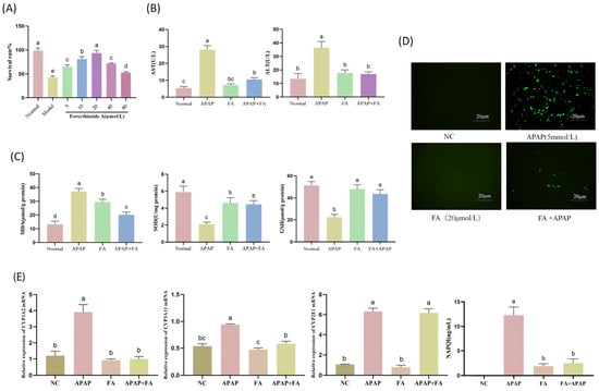 FA therapy for APAP injury in AML12. (A) CCK8 detects cellular activities in the APAP model treated with 5, 10, 20, 40, and 80 µmol of FA. Detection of (B) ALT, AST, (C) MDA, SOD, GSH, and visualization of (D) ROS levels after treatment with 20 µmol FA. (E) Detection of gene expression levels of APAP metabolism-related enzymes (CYP1A2, CYP3A11, CYP2E1) and APAP metabolite NAPQI content. Different lowercase letters indicate significant differences (p < 0.05), while the same lowercase letters indicate no significant differences (p > 0.05).