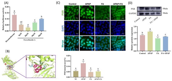FA inhibits PXR expression in AML12 cells. (A) 20 µM of FA inhibits activation of the PXR promoter. (B) Molecular docking of FA and PXR. (C) Immunofluorescence and (D) protein detection of PXR expression in AML-12 cells and visualization of results analysis. Different lowercase letters indicate significant differences (p < 0.05), while the same lowercase letters indicate no significant differences (p > 0.05).