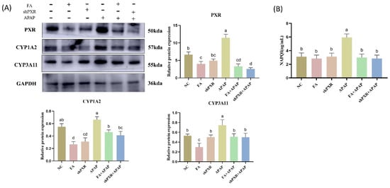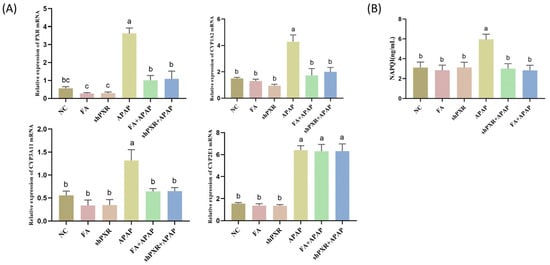 FA reduces APAP metabolism by inhibiting PXR in AML12 cells. FA reduced (A) CYP1A2 and CYP3A11 mRNA levels and (B) APAP metabolite NAPQI content by inhibiting PXR. Different lowercase letters indicate significant differences (p < 0.05), while the same lowercase letters indicate no significant differences (p > 0.05).