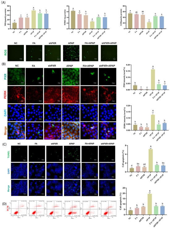 FA alleviates oxidative stress, endoplasmic reticulum stress, and apoptosis in the liver of mice by inhibiting the PXR. (A) FA down-regulated MDA levels, elevated SOD and GSH levels, and significantly reduced ROS content. (B) Inhibition of endoplasmic reticulum stress by FA in mice. Detection of protein expression of PXR and PERK by immunofluorescence double staining and its data analysis. Visualization of AML12 cell apoptosis levels using (C) TUNEL technology and (D) flow cytometry. Different lowercase letters indicate significant differences (p < 0.05), while the same lowercase letters indicate no significant differences (p > 0.05).