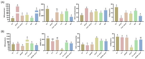 FA reduces oxidative stress levels by inhibiting PXR in mice. (A) Detect the effects of FA at different concentrations on the indicators of oxidative stress. (B) Detect the effects of the inhibition of PXR on the level of oxidative stress in the APAP injury model. Different lowercase letters indicate significant differences (p < 0.05), while the same lowercase letters indicate no significant differences (p > 0.05).