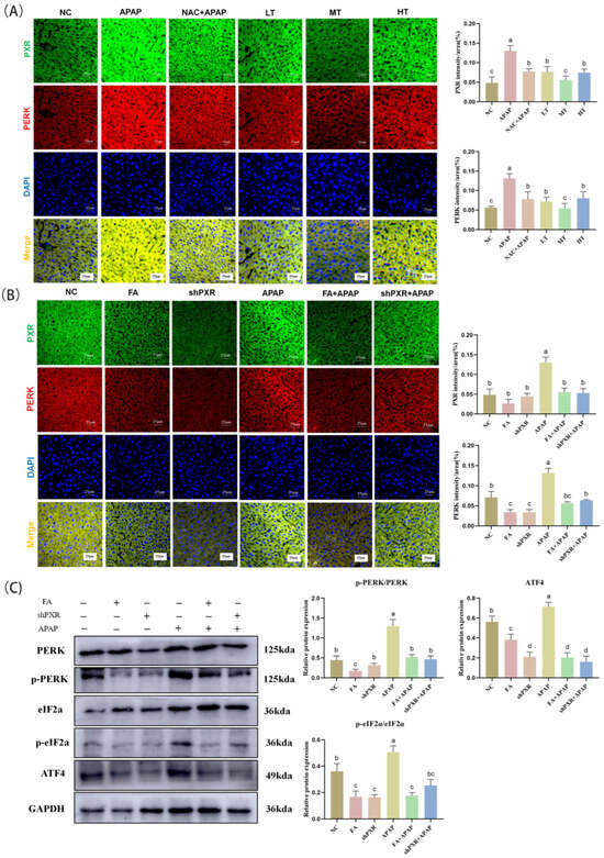 FA reduces endoplasmic reticulum stress levels by inhibiting PXR in mice. (A,B) Immunofluorescence detection of PXR and PERK expression in mice and visualization of results analysis. (C) Protein detection of PERK, p-PERK, eIF2α, p-eIF2α, and ATF4 expression in mice and visualization of Western blot results analysis. Different lowercase letters indicate significant differences (p < 0.05), while the same lowercase letters indicate no significant differences (p > 0.05).