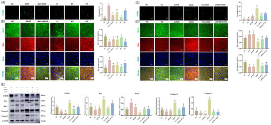 To investigate the effect of FA on APAP-induced apoptosis, TUNEL assay and immunofluorescence were used for detection. The TUNEL results showed that although FA at different doses could reduce the number of apoptotic bodies, the medium-dose FA had the best effect, which was superior to that of NAC (Figure 8A). The immunofluorescence double staining results indicated that although FA at different doses could increase the level of the anti-apoptotic factor Bcl-2 and decrease the level of the pro-apoptotic factor Bax, the medium-dose FA exhibited the optimal effect, outperforming NAC (Figure 8B).