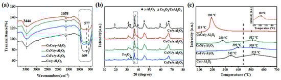 (a) FT-IR spectra, (b) XRD patterns, and (c) H2-TPR curves of the Co/γ-Al2O3 and CoM/γ-Al2O3 (M = Cu, Ni, or Fe) catalysts. * was used to mark the characteristic peak positions of Fe2O3 in XRD.
