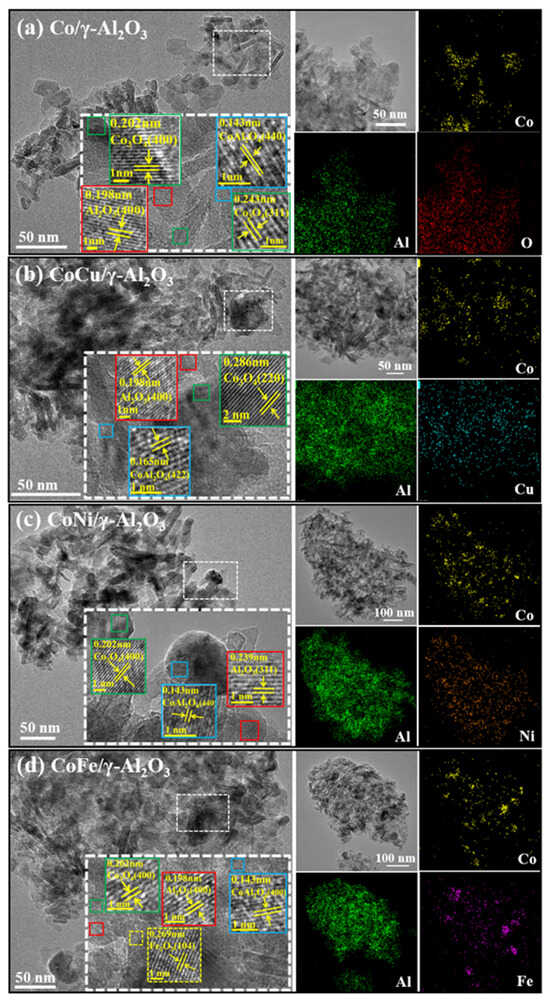 HRTEM and EDS mapping images of the fresh Co/γ-Al2O3 and CoM/γ-Al2O3 (M = Cu, Ni, or Fe) catalysts.