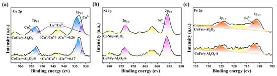 We utilized XPS to initially investigate the valence states of Co species on the surface of each catalyst. As shown in Figure 3a, the CoCu/γ-Al2O3 catalyst exhibited the highest Co3+/Co2+ ratio of 1.26, whereas the CoNi/γ-Al2O3 and Co/γ-Al2O3 catalysts had comparable Co3+/Co2+ ratios of 1.13 and 1.08, respectively. The CoFe/γ-Al2O3 catalyst displayed the lowest ratio of 1.01. Following sulfur poisoning, the Co3+ content in all catalysts decreased, as shown in Figure 3b. This decrease is attributed to the formation of inactive CoSO4 through the reaction of active Co3O4 with sulfur species. The results in Figure 3c clearly reveal that the CoCu/γ-Al2O3 catalyst exhibited the smallest change in the active Co3+/Co2+ ratio after sulfur poisoning, exhibiting a decrease of only 0.09. This result suggests that the interaction between Cu and Co hinders the binding of Co3+ to sulfur species. Additionally, we analyzed the valence states of the doped metals: Cu, Ni, and Fe. For the CoCu/γ-Al2O3 catalyst, an XPS peak corresponding to Cu2+ species was observed at 933.9 eV, along with a minor peak attributed to low-valence Cu+ (Cu0) species at 932.1 eV (Figure 4a). The peaks at 571 and 569 eV in the Cu LMM Auger spectrum (see Figure S4) also confirmed the coexistence of Cu+ and Cu0 species [39]. Despite the reaction of some CuOx with sulfur species to form CuSO4 upon sulfur poisoning, the surface of CoCu/γ-Al2O3 maintained significant amounts of Cu+ and Cu0. Conversely, the Ni 2p and Fe 2p XPS profiles (Figure 4b,c) indicate a single oxidation state for NiO and Fe2O3 in CoNi/γ-Al2O3 and CoFe/γ-Al2O3, respectively [40,41,42]. It is well known that transition metals with variable oxidation states are beneficial for promoting the redox performance of catalysts. The CoCu/γ-Al2O3 catalyst contains Cu2+/Cu+(Cu0) and Co3+/Co2+ redox pairs, which can facilitate electron transfer and promote the redox reaction of Cu+(Cu0) + Co3+ ↔ Cu2+ + Co2+. Consequently, Cu and Co exhibit a strong synergistic effect, with Cu inhibiting the formation of inactive CoAl2O4 from Co3O4 and enhancing the dispersion of Co species on the support, thereby maintaining the stable, active Co3O4 phase. At the same time, Co also promotes electron transfer between different Cu oxide species with different valence states, enabling the formation of highly active Cu+ (Cu0) species, thereby enhancing the catalytic redox performance. In contrast, the weaker interaction between Ni and Co in the CoNi/γ-Al2O3 catalyst has a minimal effect on the state of Co species. The greater decrease in the Co3+/Co2+ ratio of the CoFe/γ-Al2O3 catalyst after poisoning is due to the inability of Fe to influence the dispersion state of Co, causing it to further aggregate and more easily react with sulfur species to form inactive CoAl2O4.