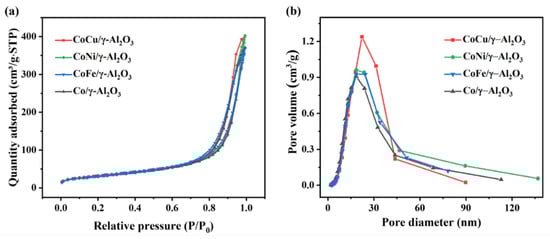N2 adsorption/desorption isotherms and (b) pore-size distributions (a) of the fresh Co/γ-Al2O3 and CoM/γ-Al2O3 (M = Cu, Ni, or Fe) catalysts.