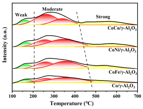 We comprehensively analyzed the influence of adding a second metal on the acidity of the Co/γ-Al2O3 catalyst by using NH3-TPD experiments (Figure 6). The Co/γ-Al2O3 catalyst contains numerous weak-to-moderately strong acidic sites, as well as a limited number of strong acidic sites. After the introduction of Cu, Ni, or Fe, the number of acidic sites on the catalyst differed. Specifically, the CoCu/γ-Al2O3 catalyst exhibited a significant increase in moderately strong and strong acidic sites (0.10390 mmol NH3/gcat.), and the CoNi/γ-Al2O3 catalysts also developed a specific level of strong acidic sites (0.08208 mmol NH3/gcat.). In contrast, the acidity of the CoFe/γ-Al2O3 catalyst increased only slightly, and the detailed data are presented in Table 2. The addition of a second metal improves the acidity of the Co/γ-Al2O3 catalyst, likely due to the interactions between the added metal, Co, and the γ-Al2O3 support. A stronger interaction between the metal species enhances the ability of the acidic sites to bind protons within the catalytic system, resulting in an overall increase in the acidity of the system.
