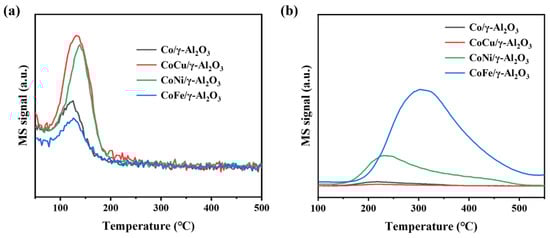 Toluene-TPD tests confirmed that increasing the strongly acidic sites favored toluene adsorption (Figure 7a). The toluene desorption peak areas of the CoCu/γ-Al2O3 and CoNi/γ-Al2O3 catalysts were notably larger than those of CoFe/γ-Al2O3 and Co/γ-Al2O3, suggesting higher abundance of toluene adsorption sites on their surfaces. Catalysts with a higher concentration of strongly acidic sites exhibit enhanced toluene adsorption, which facilitates the activation of C-C and C-H bonds [45]. Conversely, the CoFe/γ-Al2O3 catalyst with weaker acidity demonstrated the lowest toluene adsorption capacity. Furthermore, the characteristics of the acidic centers in a catalyst influence its SO2 adsorption capacity. In SO2-TPD experiments, the CoFe/γ-Al2O3 catalyst provided the largest SO2 adsorption peak area and higher adsorption temperatures (Figure 7b), suggesting a strong adsorption of SO2, with a lower likelihood of the desorption of the adsorbed sulfur species, indicating increased risk of sulfur poisoning. The CoNi/γ-Al2O3 catalyst exhibited specific adsorption capacity for SO2. In contrast, the CoCu/γ-Al2O3 and Co/γ-Al2O3 catalysts exhibited limited SO2 adsorption capacity, indicating that in sulfur-rich environments, only a small fraction of the surface species interact with sulfur species and a larger proportion of the active components can be retained. Consequently, they are more suitable for the catalytic oxidation of sulfur-containing VOCs.