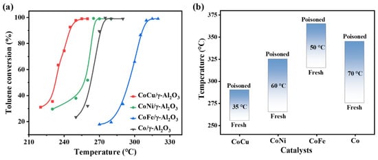 (a) Toluene conversion on fresh Co/γ-Al2O3 and CoM/γ-Al2O3 (M = Cu, Ni, or Fe) catalysts. (b) Comparison of T99 for toluene combustion over fresh and sulfur-poisoned Co/γ-Al2O3 and CoM/γ-Al2O3 (M = Cu, Ni, or Fe) catalysts.