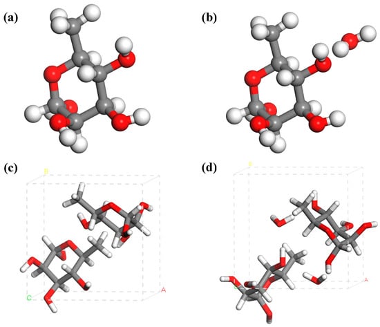 Molecular structure diagrams of L-rhamnose (a) and rhamnose monohydrate (b), and unit cell diagrams of L-rhamnose (c) and L-rhamnose monohydrate (d). The white, gray, and red spheres represent hydrogen (H) atoms, carbon (C) atoms, and oxygen (O) atoms, respectively. ABC represents the unit cell parameters.