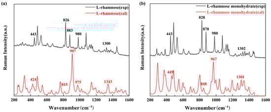 Figure 3 shows a comparison of the experimental and calculated Raman spectra of L-rhamnose and L-rhamnose monohydrate in the 200–1600 cm−1 range. The findings reveal that both compounds generally exhibit similar scattering peak characteristics. More specifically, peaks in the 400–450 cm−1 and 810–900 cm−1 ranges correspond to the bending vibrations of the -OH group and the symmetric and asymmetric stretching vibrations, respectively. Additionally, peaks near 980 cm−1 and 1300 cm−1 are attributed to the torsional vibration of the -O- group and the wagging vibration of the -OH group, respectively. These regions are crucial for understanding the vibrational characteristics of both L-rhamnose and its monohydrate, highlighting their structural similarities in terms of functional group vibrations.