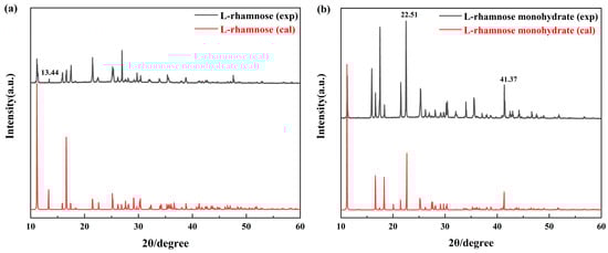Additionally, the calculated PXRD in Figure 4a,b shows excellent agreement with the experimental spectra of L-rhamnose and its monohydrate. This strong consistency validates the structural model used in the computational simulations and confirms the rationality of the unit cell structure representing L-rhamnose and its monohydrate.