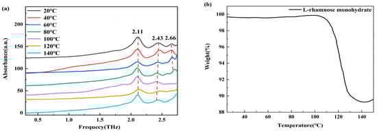 (a) THz spectra of L-rhamnose monohydrate at different temperatures (spectra are vertically offset for clarity); (b) TGA curve of L-rhamnose monohydrate.