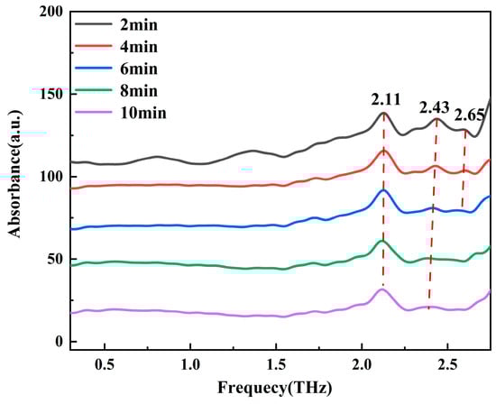 Figure 6 presents the THz spectra of L-rhamnose monohydrate subjected to dehydration in a vacuum desiccator at 100 °C over various time intervals. The spectra indicate that within 6 min of heating, the absorption peaks at 2.43 and 2.65 THz show a gradual decrease in intensity. After 6 min, these peaks have largely vanished and the spectral curve levels off, suggesting that the dehydration process of L-rhamnose monohydrate is nearly complete by this time. Subsequently, we analyzed the dehydrated L-rhamnose monohydrate and observed that its THz absorption spectrum was identical to that of L-rhamnose, confirming that the dehydration reaction had occurred. During the heating process, L-rhamnose monohydrate loses a water molecule from its unit cell, transforming into anhydrous L-rhamnose.