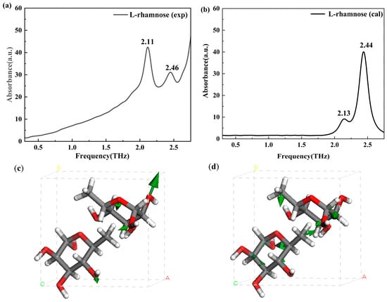 Experimental (a) and calculated (b) THz spectra, and vibrational modes of L-rhamnose at 2.13 THz (c) and 2.44 THz (d). ABC represents the unit cell parameters, and the green arrow indicates the vibrational direction at the corresponding THz frequency.