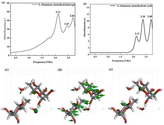 Experimental (a) and calculated (b) THz spectra, and vibrational modes of L-rhamnose monohydrate at 2.12 THz (c), 2.38 THz (d), and 2.68 THz (e). ABC represents the unit cell parameters, and the green arrow indicates the vibrational direction at the corresponding THz frequency.
