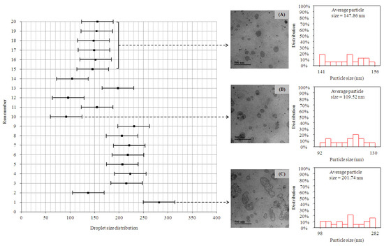 Cryo-transmission electron microscope images and size distribution of the complex W1/O/W2 emulsions: (A) 5% (w/w) SPI + 10% (w/w) MD + 0.25% (w/w) PGA (run numbers 15–20); (B) 10% (w/w) SPI + 10% (w/w) MD + 0.25% (w/w) PGA (run number 10); (C) 2.113% (w/w) SPI + 4.227% (w/w) MD + 0.106% (w/w) PGA (run number 1). W1/O/W2: water-in-oil-in-water, SPI: soy protein isolate, MD: maltodextrin, PGA: propylene glycol alginate.