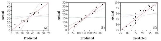 The predicted values were calculated using model-fitting techniques; fitting data to different models (linear, two-factorial, quadratic, and cubic), the quadratic polynomial model was most suitable according to ANOVA results. A strong relationship between predicted and experimental values was evident, as shown in Figure 2. The study’s purpose using response surface modeling was to find an optimal region for response variables and determine correlations between three independent variables and response variables. As shown in Figure 2, a formula containing 7.887% (w/w) SPI, 15.774% (w/w) MD, and 0.395% (w/w) PGA was optimal, yielding the best encapsulation efficiency and stability in a favorable viscosity region (<300 mPa).