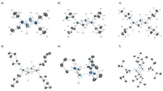 An attractive feature of the amidoalanes 1a–e is their high crystallinity which greatly facilitates their isolation and purification. To confirm their identities, their purities (the complexes are sometimes too reactive for routine CHN combustion analyses) and to determine their degree of aggregation in the solid state, X-ray structural studies on all of the compounds isolated were carried out. The structures of the amidoalanes 1a–b, 1d–f, and 2 are shown in Figure 2. The X-ray structure of 1c is identical to that crystallographically reported (but without any supporting spectroscopic data) in the literature []. Comparative structural data for the dimeric compounds 1a–e and 2 are given in Table 2.