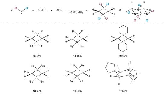 The most common routes to species 1 are either the direct reaction of the amine with AlH3•NR3 (R = Me, Et), the reaction of the amidoaluminium dichloride with LiH, or the generation of AlH3 through the in situ protonation of LiAlH4 via the ammonium salt of the amine [,,,,,,,]. Herein, we report a facile, one-pot synthesis of a range of exogenous Lewis-base free amidoalanes [H2Al(NR2)]n (n = 2–3) and explore the properties of these compounds. Conveniently, multigram quantities of these reagents are easily attained, without the need to use pyrophoric AlH3.