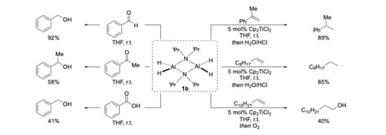 - Hydroalumination of carbonyl compounds: In a nitrogen-filled glovebox, an oven-dried Schlenk tube was charged with amidoalane 1b (0.225 mmol), carbonyl compound (0.205 mmol), and THF (1 mL). The flask was removed from the glovebox and stirred for 2 h at room temperature. After 2 h, the reaction was quenched with HCl(aq) and the layers separated, and the aqueous phase was extracted with diethyl ether (3 × 5 mL). The yield was determined by 1H NMR spectroscopy using 1,1,2,2-tetrachloroethane as the internal standard.