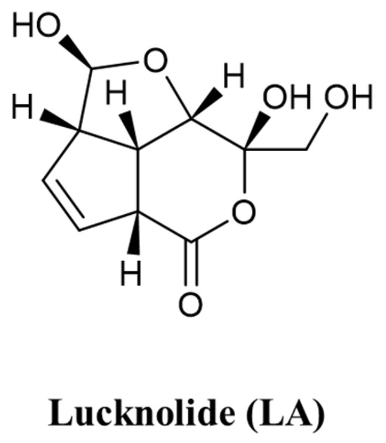 Lucknolide A (LA) was isolated and structurally identified from a marine-derived Streptomyces strain 151KO-065, as described in our recent study [14]. The strain 151KO-065 was isolated from a mangrove sample collected near Kosrae Island and identified as Streptomyces sp. by 16S rRNA gene sequence analysis. After large-scale fermentation, the culture broth was subjected to solvent extraction, and the culture extract was fractionated using column chromatography. A fraction with unusual peaks in the 1H NMR spectrum was further purified using HPLC, leading to the isolation of LA. LA was obtained as a white powder and displayed an [M−H]− ion peak at m/z 227.17, corresponding to a molecular formula of C10H12O6. Analysis of 1H, 13C NMR, HSQC, 1H-1H COSY, and HMBC spectra confirmed the structure of LA (Figure 1).